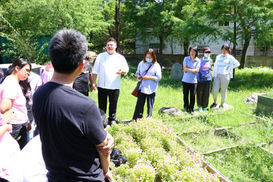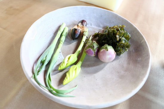 回到銘師父餐廳,先跟莊主廚進入有機菜園,認識可以入菜的植物,也參觀廚房的設備。莊育賢主廚今天準備五道料理,是以在市場採買的食材為主。他一邊烹飪,一邊和學員們分享烹調方式。